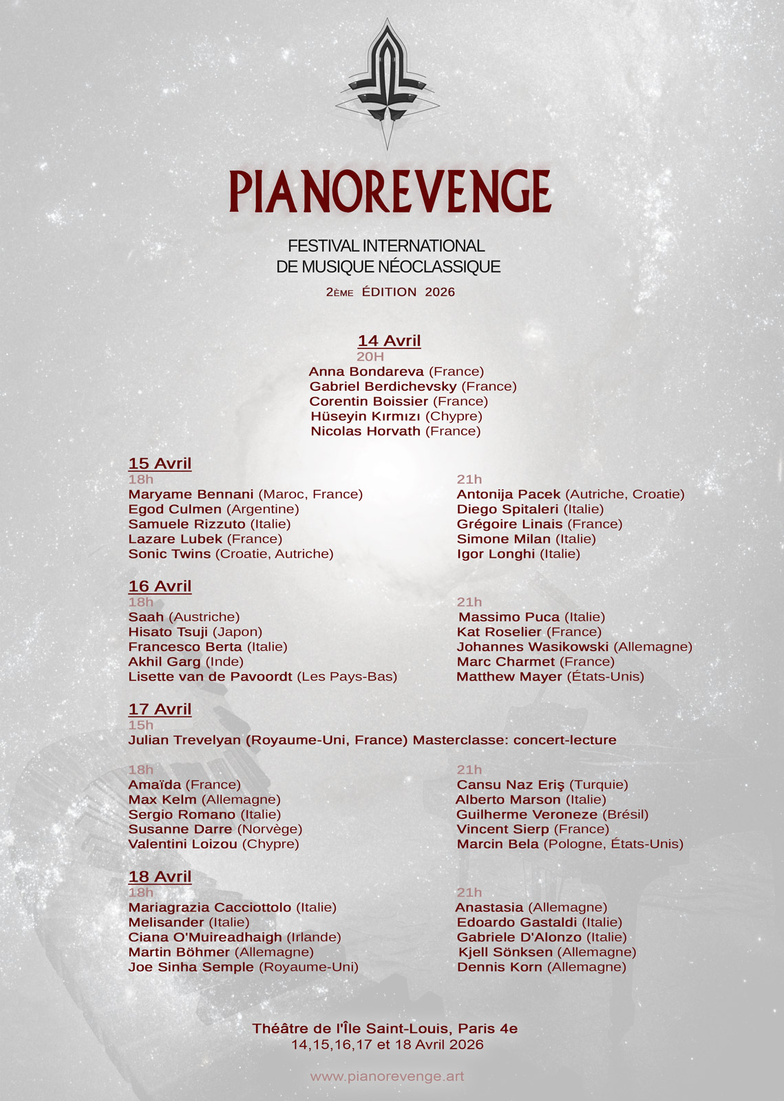 The piano is not just an instrument—it is a bridge between eras, cultures, and souls. In a world saturated with noise, it remains a refuge: each key struck is a confession, a revolt, or a prayer. Today’s pianists don’t just play; they reinvent the legacy of Liszt, Rachmaninov, or Björk, transforming the keyboard into a laboratory of new emotions. Why do we create? Because music is an act of resistance. Resisting oblivion, indifference, and the fragmentation of the world. The improviser defies boundaries, the composer sculpts the ephemeral, and the performer becomes the translator of the unspeakable. Artistic motivation arises from this urgency: to say what cannot be silenced. Supporting artists is fueling this flame. The Piano Revenge Festival 2026 (Paris, April 2026) embodies this commitment. This international event brings together contemporary pianists from the different corners of the globe—from Japan to Brazil, from Italy to USA—to celebrate the diversity of artistic voices and visions. Here, neoclassical music embraces with a new piano tradition, and each performance is a manifesto against uniformity.